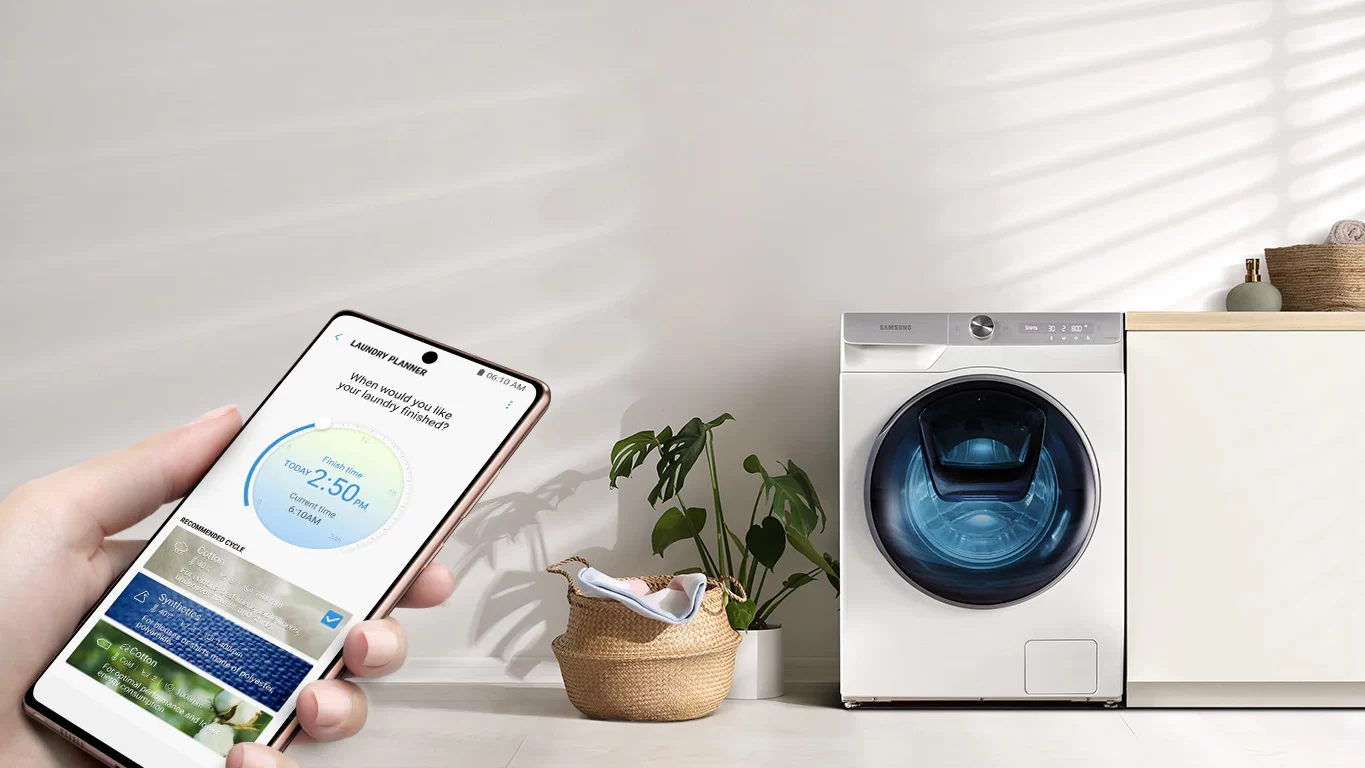 Kad steidzīgais ritms liek meklēt jaunus risinājumus efektīvākai dienas plānošanai, ar Samsung lietotnes SmartThings palīdzību iekārtas ir iespējams pārvaldīt viedtālrunī. Tagad var uzsākt mazgāšanu, pat atrodoties sastrēgumā, vai arī doties gulēt, uzstādot laiku, kad veļai ir jābūt tīrai. Vēl lielākai ērtībai SmartThings lietotnē ir iespējams digitāli savienot veļas mašīnu un žāvētāju, nodrošinot automātisku žāvēšanas cikla pielāgošanu.